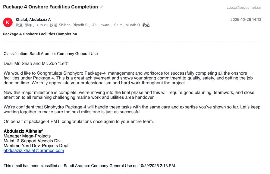 2025年10月30日,由水電五局承建的沙特國王港項目P4包在沙特阿美業(yè)主會議室舉行陸域建筑物全面移交慶典。P4包率先完成全部陸域建筑物移交任務(wù)。 P4包陸域建筑物共48個單體,工程規(guī)模宏大、技術(shù)復(fù)雜、環(huán)境艱苦。10月29日,隨著最后一個單體——B303多功能綜合大樓完成全部尾項消缺并順利移交,標志著P4包陸域建筑物移交任務(wù)全面告捷,項目建設(shè)進入最后沖刺階段。P4包業(yè)主項目經(jīng)理哈拉夫(Khalaf)發(fā)來感謝信,信中寫道:“這一成就彰顯了你們對質(zhì)量、安全和按時完成工作的堅定承諾。我們由衷感謝你們在整個項目期間展現(xiàn)的專業(yè)精神和辛勤工作。” 沙特國王港項目位于沙特東部省朱拜勒市拉斯海爾工業(yè)園區(qū),由薩勒曼國王親自奠基并命名,是沙特“2030愿景”的重要組成部分。本項目創(chuàng)造了多個世界之最:占地面積11.25平方公里——全球規(guī)模最大的超級船廠;巨型龍門吊聯(lián)合吊裝重量達2100噸——吊裝能力位居全球前列;25000噸的升船能力——全球最大的升船機系統(tǒng);碼頭總長7公里——全球最長的碼頭。 |
