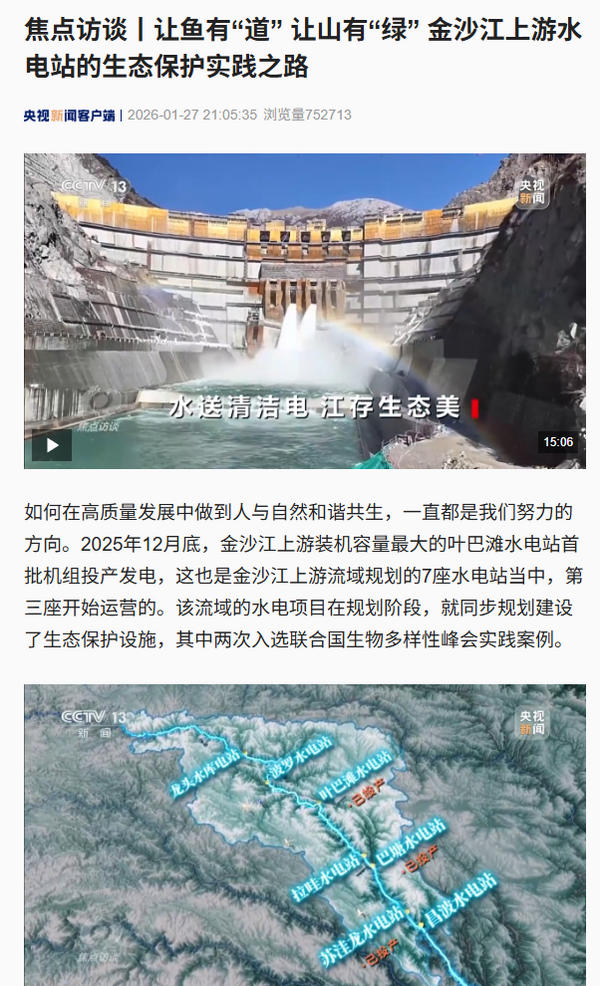 近日,央視《焦點訪談》報道:讓魚有“道” 讓山有“綠” 金沙江上游水電站的生態保護實踐之路。報道中長篇幅提及由中國電建設計承建的金沙江上游葉巴灘水電站,該電站是我國在建海拔最高雙曲拱壩電站。