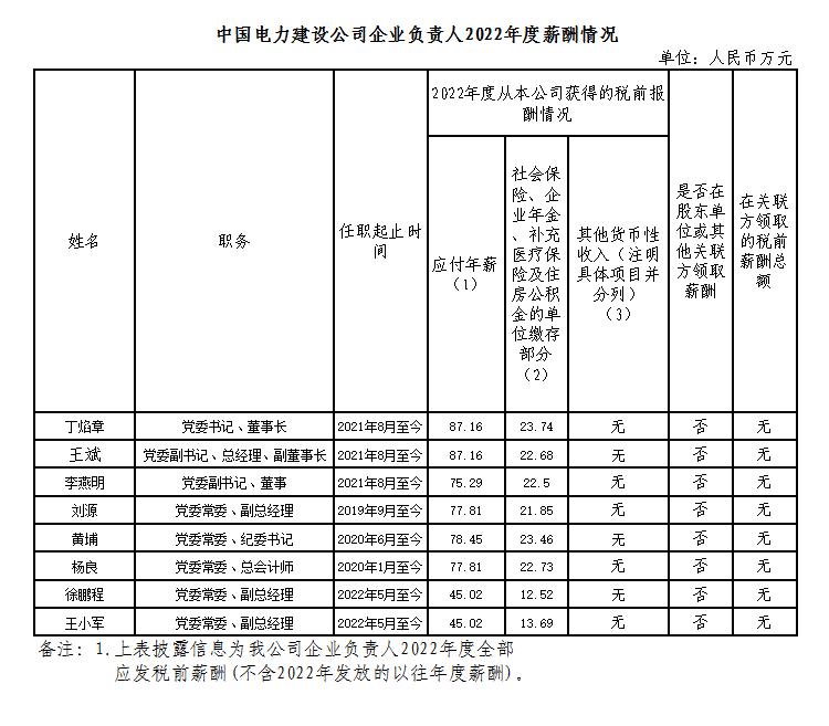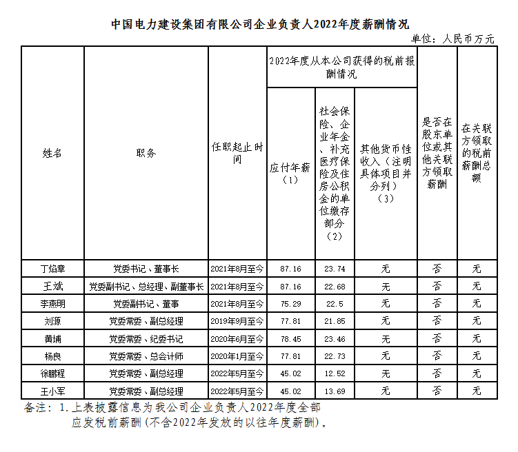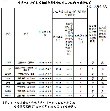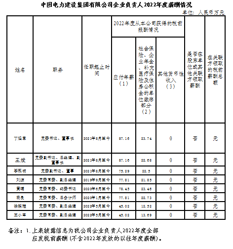 中國電力建設集團有限公司企業負責人2022年度薪酬情況